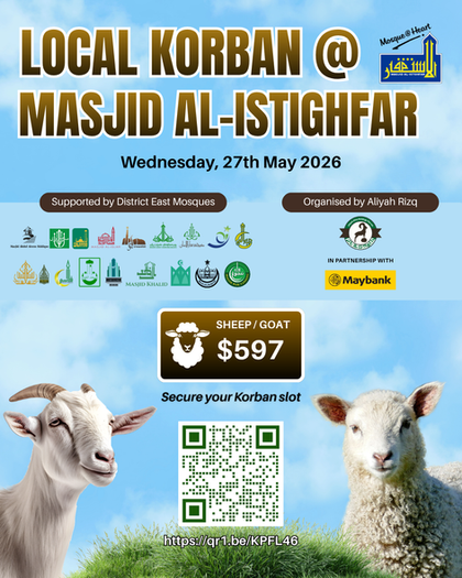 Local Live Korban is performed at Masjid Al-Istighfar physically, organised by Aliyah Rizq; Sohibul Korban will be able to witness the slaughtering of their livestock